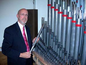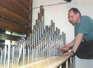 The OPRC organ is controlled by a state of the art console. It's actually a computer attached to keyboards. When depressed, each key send a signal to the computer which in turn sends a signal to open the small "door" attached to the windchest under each pipe. When that "door" opens it allows the air within the windchest to escape up through the pipe.